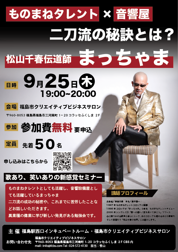 “ものまねタレント”と”音響屋”の二刀流として日本全国で活躍している「まっちゃま」氏を講師にお招きし、華やかな世界の裏側、個人事業主としてのマインドと秘訣などをお話頂きます。