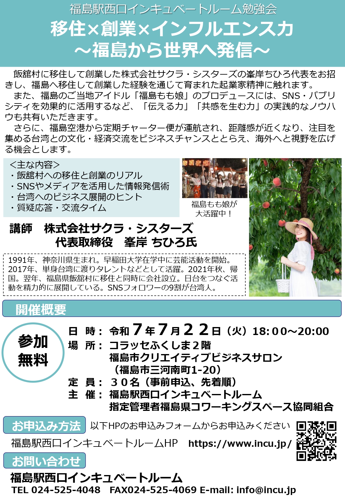 また、福島のご当地アイドル「もも娘」のプロデュースには、SNS・パブリシティを効果的に活用するなど、「伝える力」「共感を生む力」の実践的なノウハウも共有いただきます。